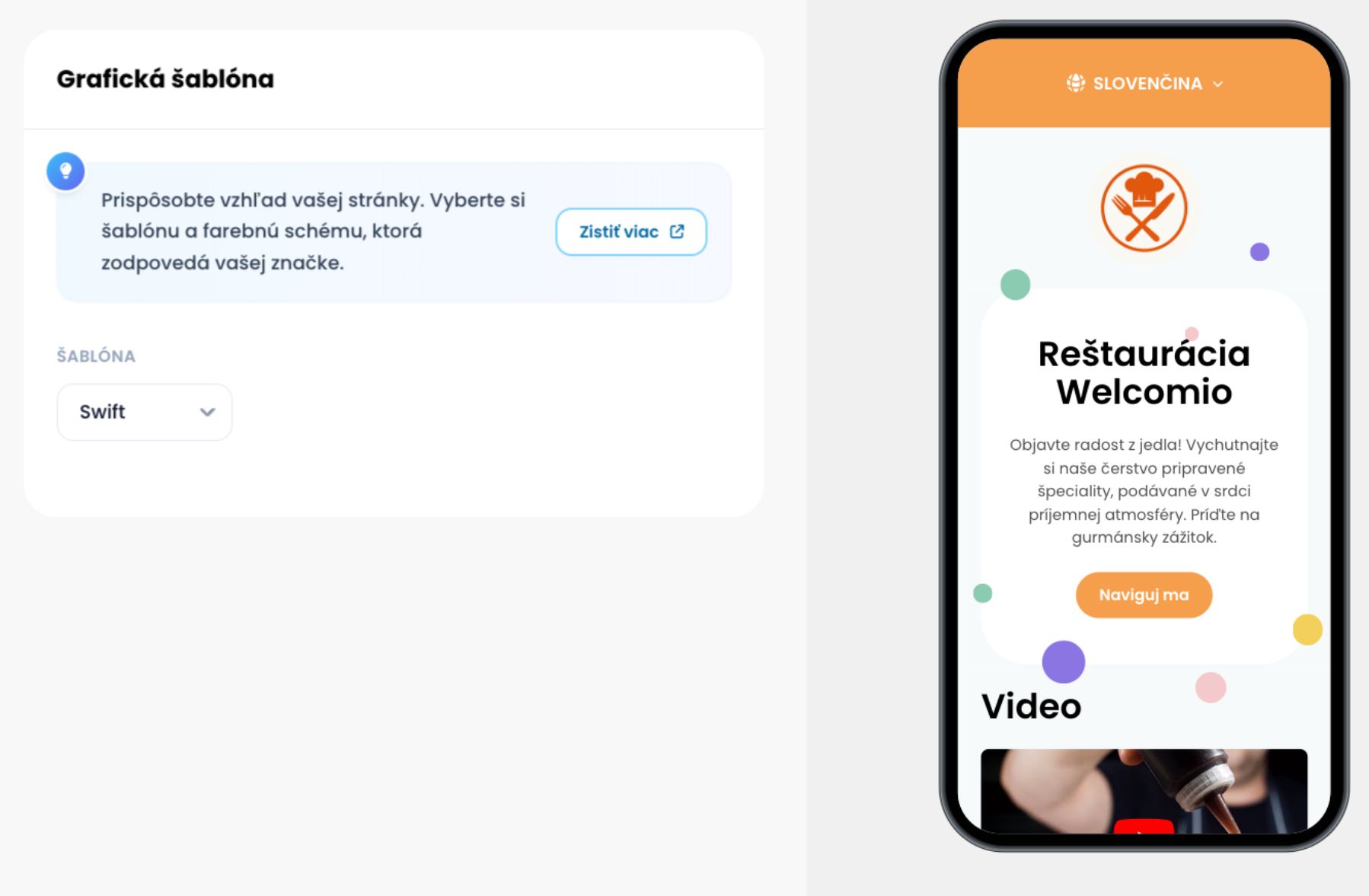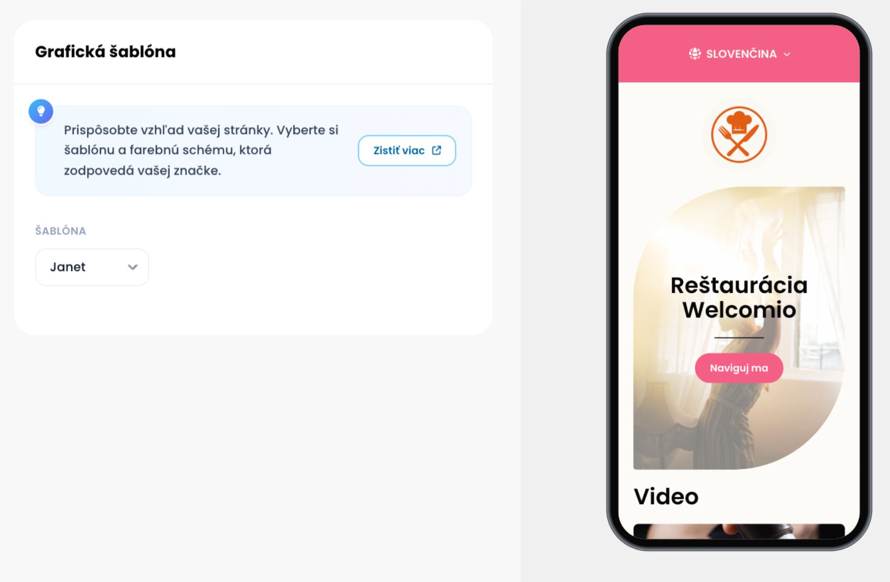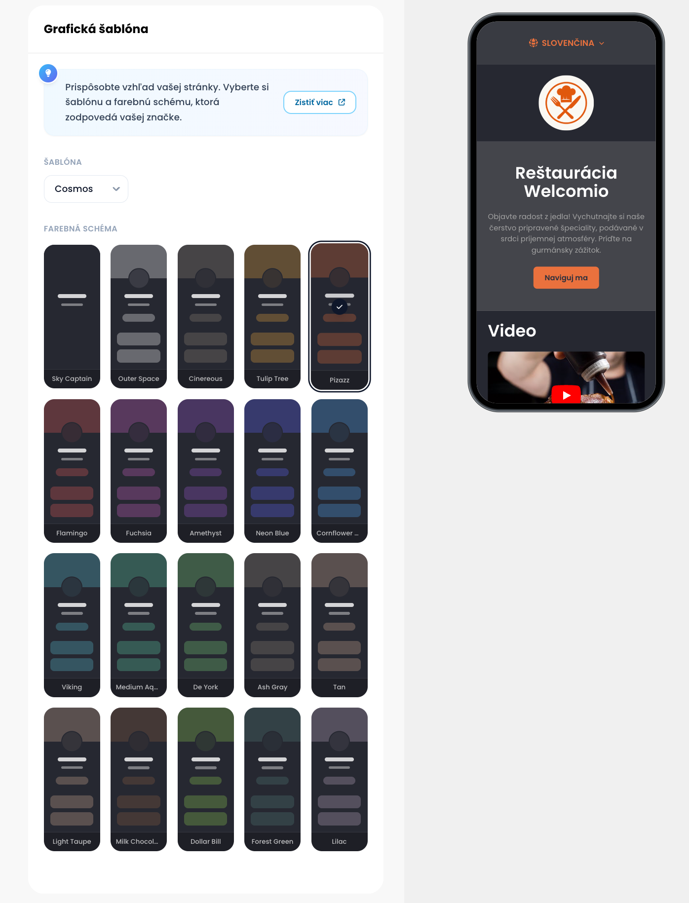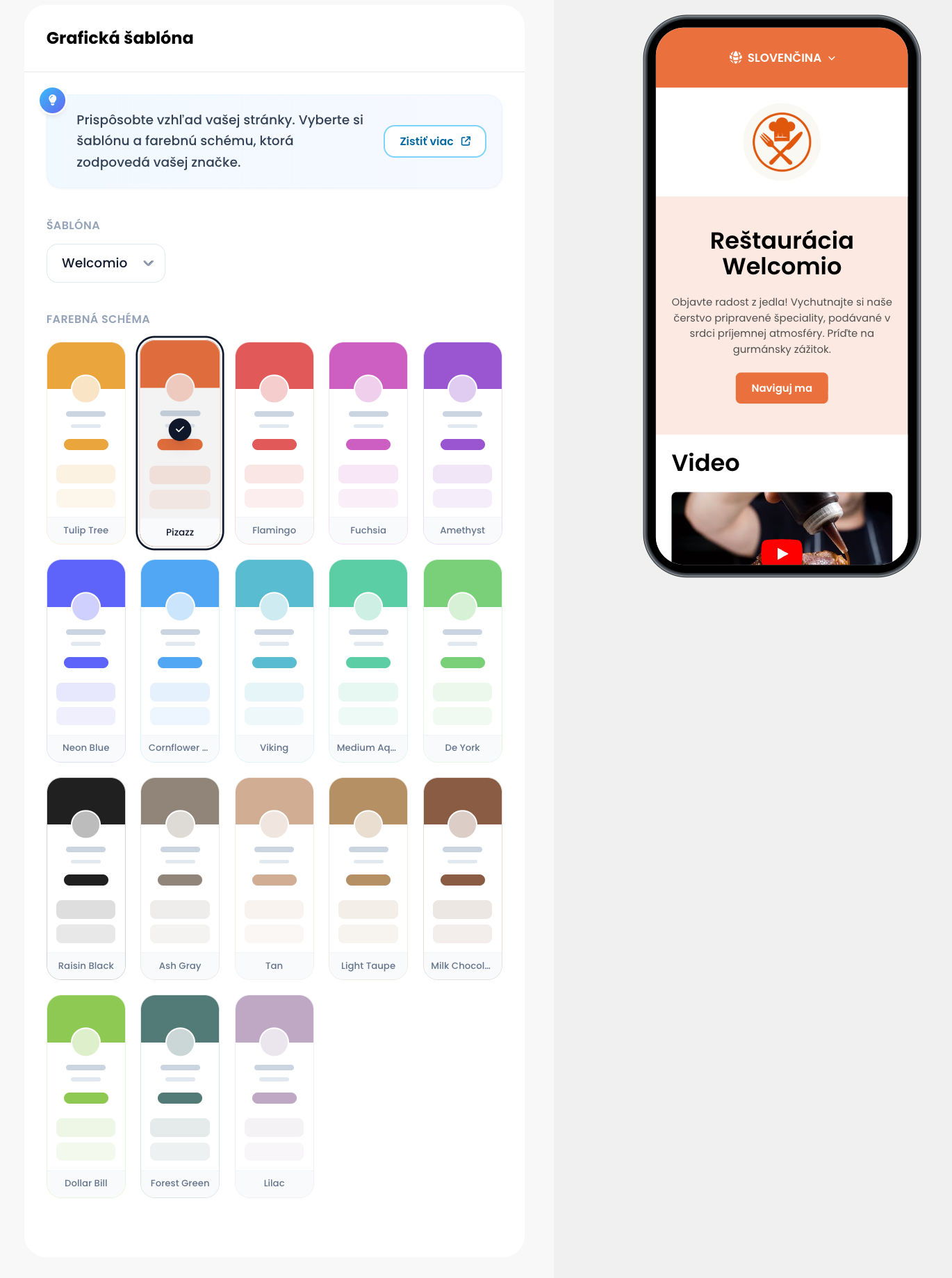 Zmeniť grafickú šablónu môžete na Welcomio.com prejdením do hlavného menu na Nastavenia → Grafická šablóna.